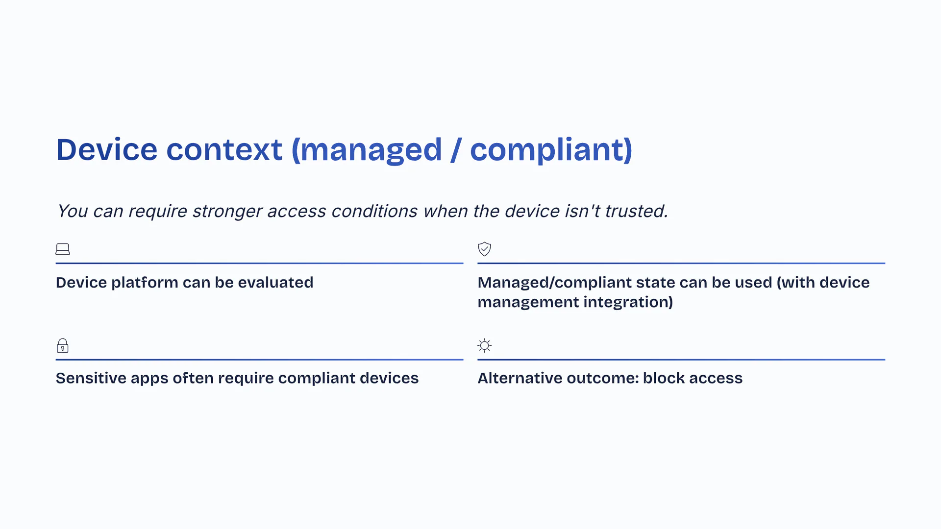 You can require stronger access conditions when the device isn't trusted. Device platform can be evaluated. Managed/compliant state can be used (with device management integration). Sensitive apps often require compliant devices. Alternative outcome: block access.