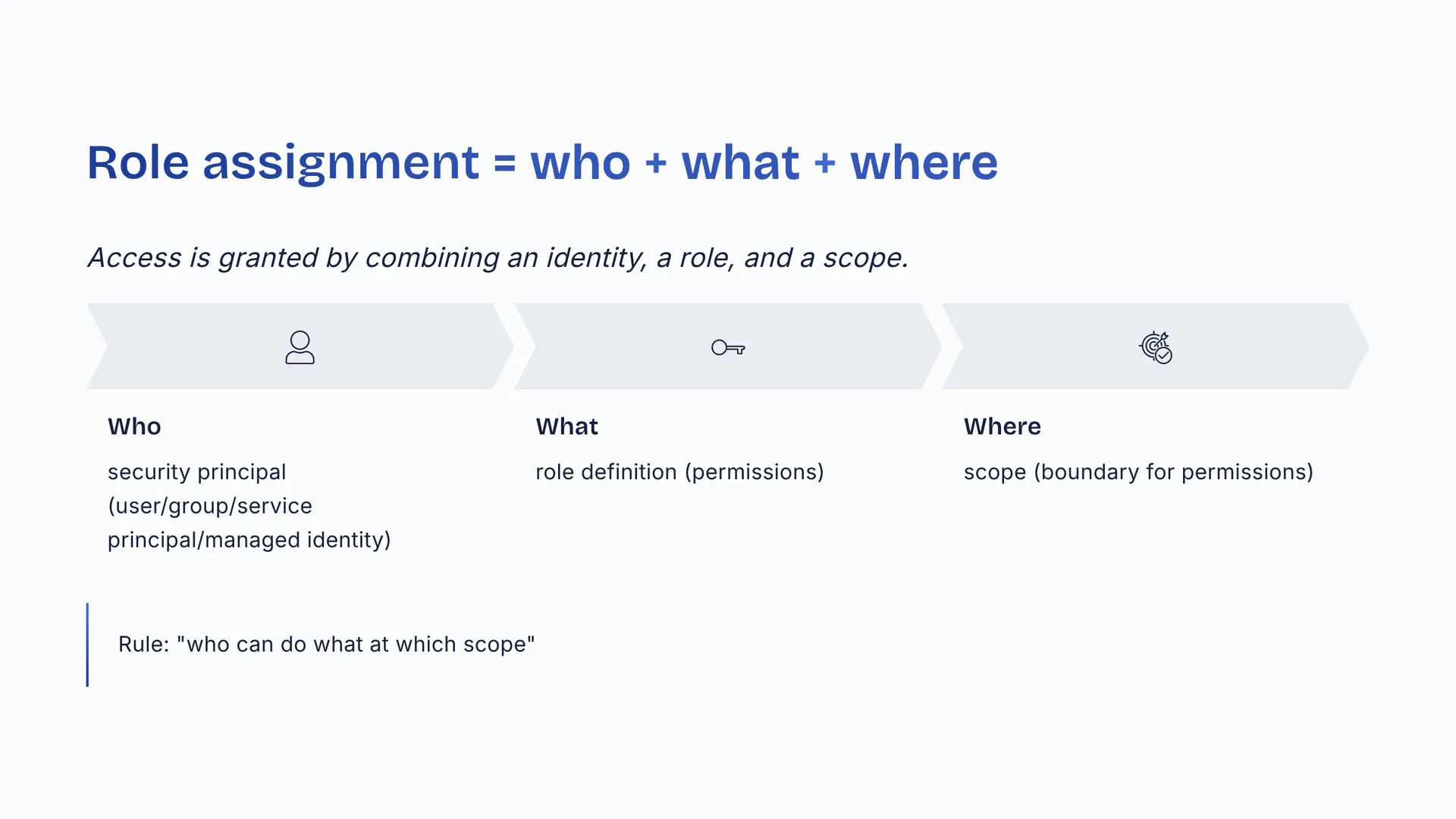 Access is granted by combining an identity, a role, and a scope. Who: security principal (user/group/service principal/managed identity). What: role definition (permissions). Where: scope (boundary for permissions). Rule: 'who can do what at which scope'.