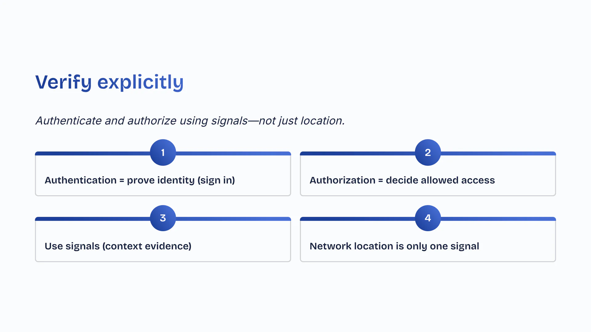 Authenticate and authorize using signals—not just location. Authentication equals prove identity (sign in). Authorization equals decide allowed access. Use signals (context evidence). Network location is only one signal.