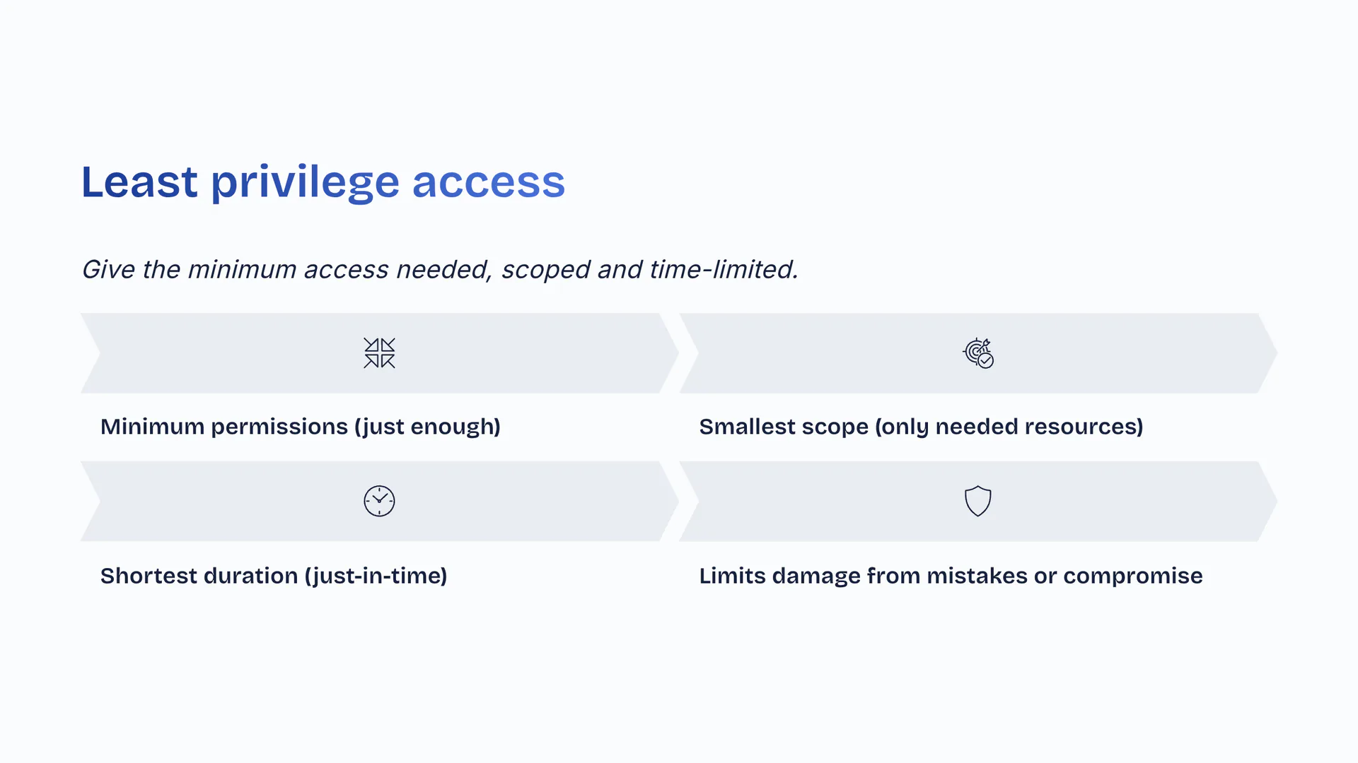 Least privilege accessGive the minimum access needed, scoped and time-limited. Minimum permissions (just enough). Smallest scope (only needed resources). Shortest duration (just-in-time). Limits damage from mistakes or compromise.