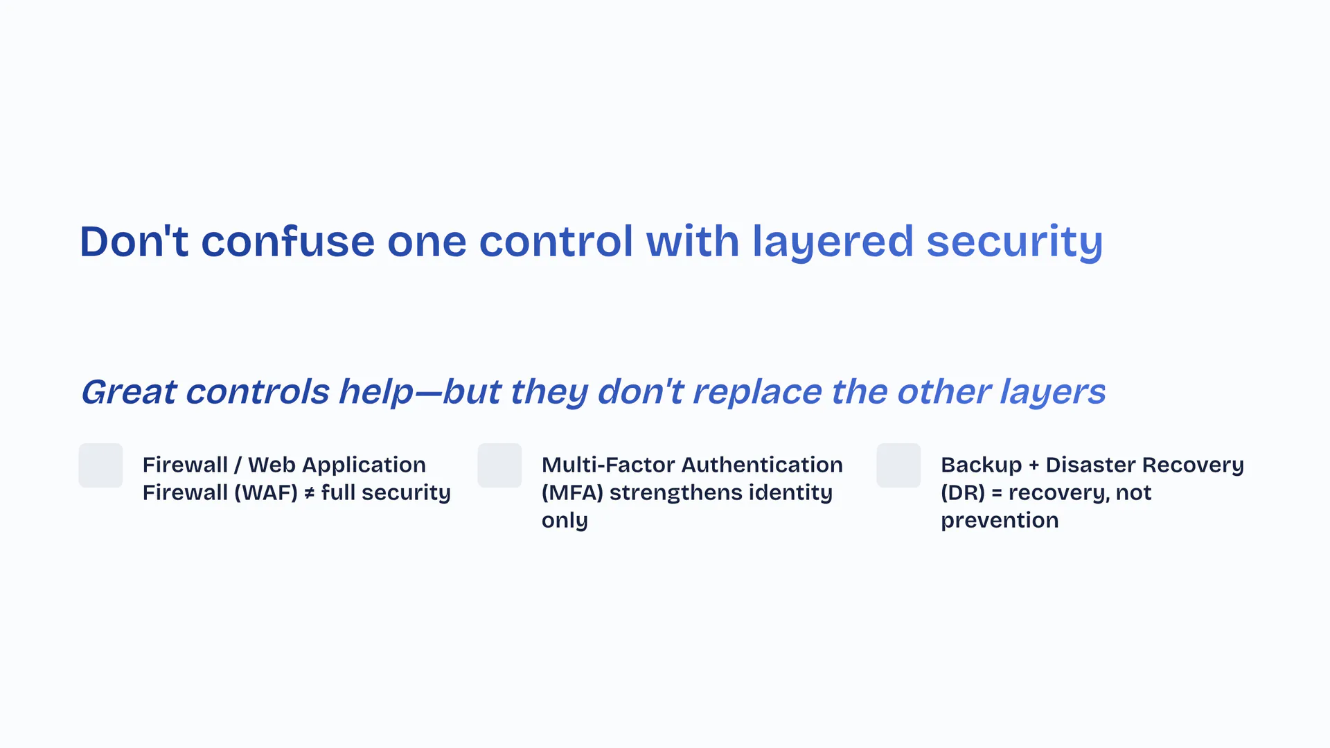 Great controls help—but they don't replace the other layers. Firewall / Web Application Firewall (WAF) does not equal full security. Multi-Factor Authentication (MFA) strengthens identity only. Backup plus Disaster Recovery (DR) equals recovery, not prevention.