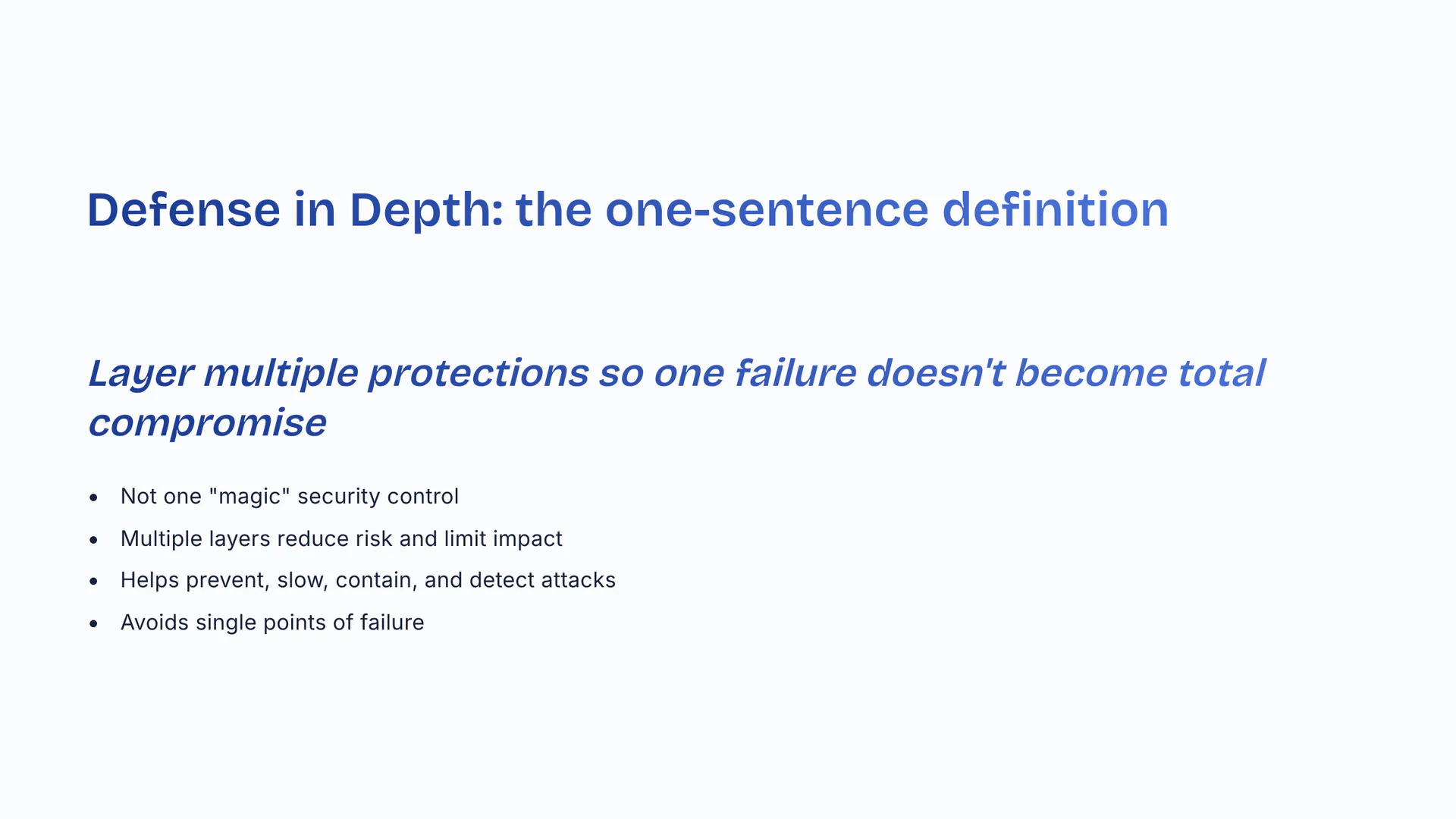Layer multiple protections so one failure doesn't become total compromise. Not one 'magic' security control. Multiple layers reduce risk and limit impact. Helps prevent, slow, contain, and detect attacks. Avoids single points of failure.