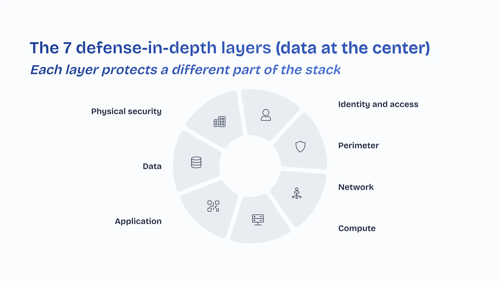 The 7 defense-in-depth layers (data at the center)Each layer protects a different part of the stack. Physical security. Identity and access. Perimeter. Network. Compute. Application. Data.