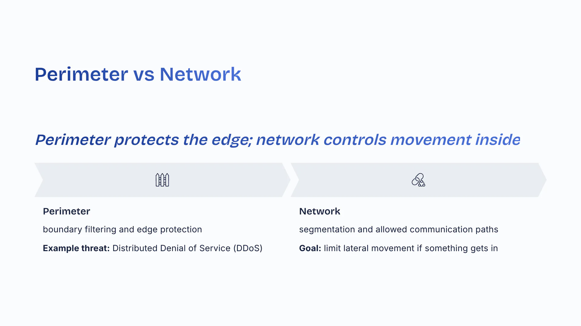 Perimeter protects the edge; network controls movement inside. Perimeter: boundary filtering and edge protection. Example threat: Distributed Denial of Service (DDoS). Network: segmentation and allowed communication paths. Goal: limit lateral movement if something gets in.