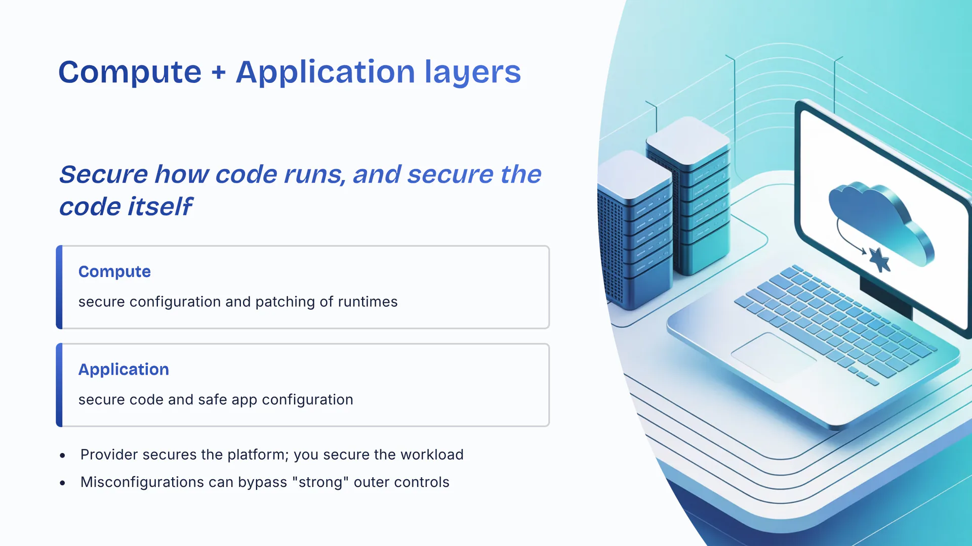 Secure how code runs, and secure the code itself. Compute: secure configuration and patching of runtimes. Application: secure code and safe app configuration. Provider secures the platform; you secure the workload. Misconfigurations can bypass 'strong' outer controls.