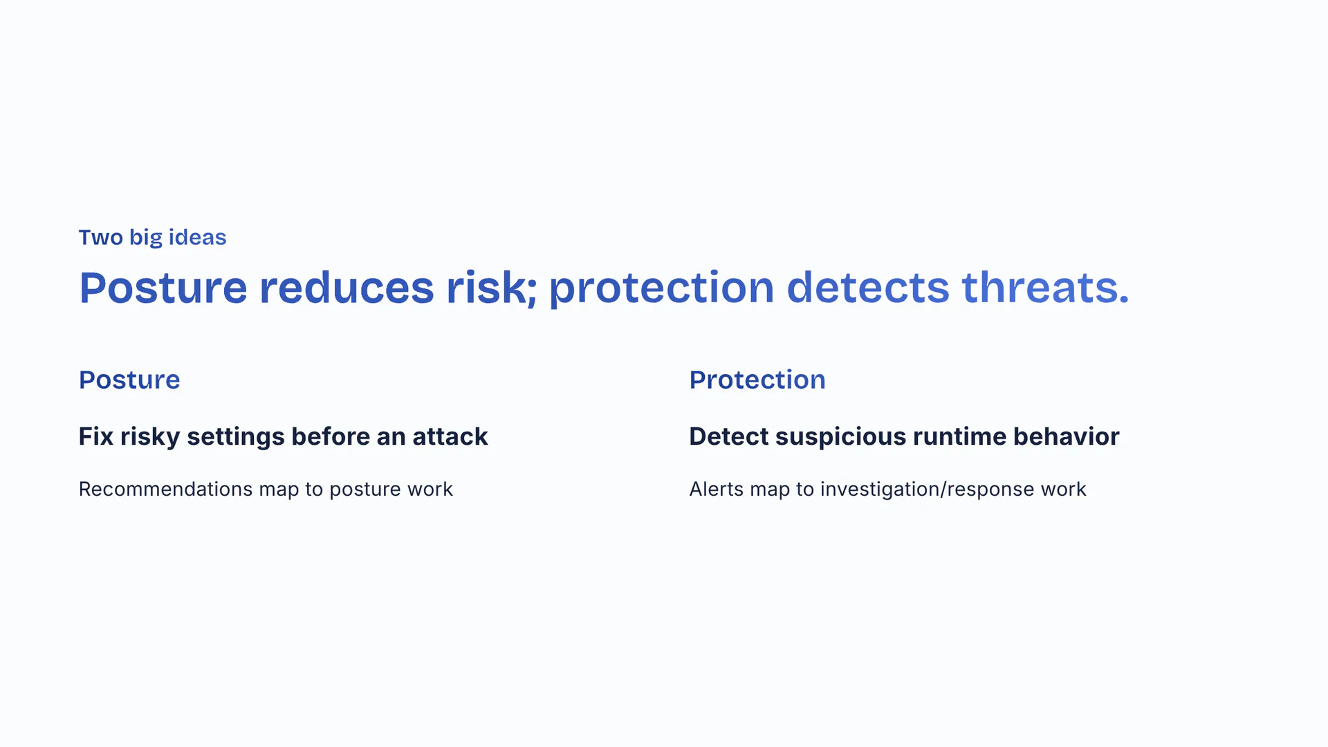 Two big ideasPosture reduces risk; protection detects threats. Posture equals fix risky settings before an attack. Protection equals detect suspicious runtime behavior. Recommendations map to posture work. Alerts map to investigation/response work.