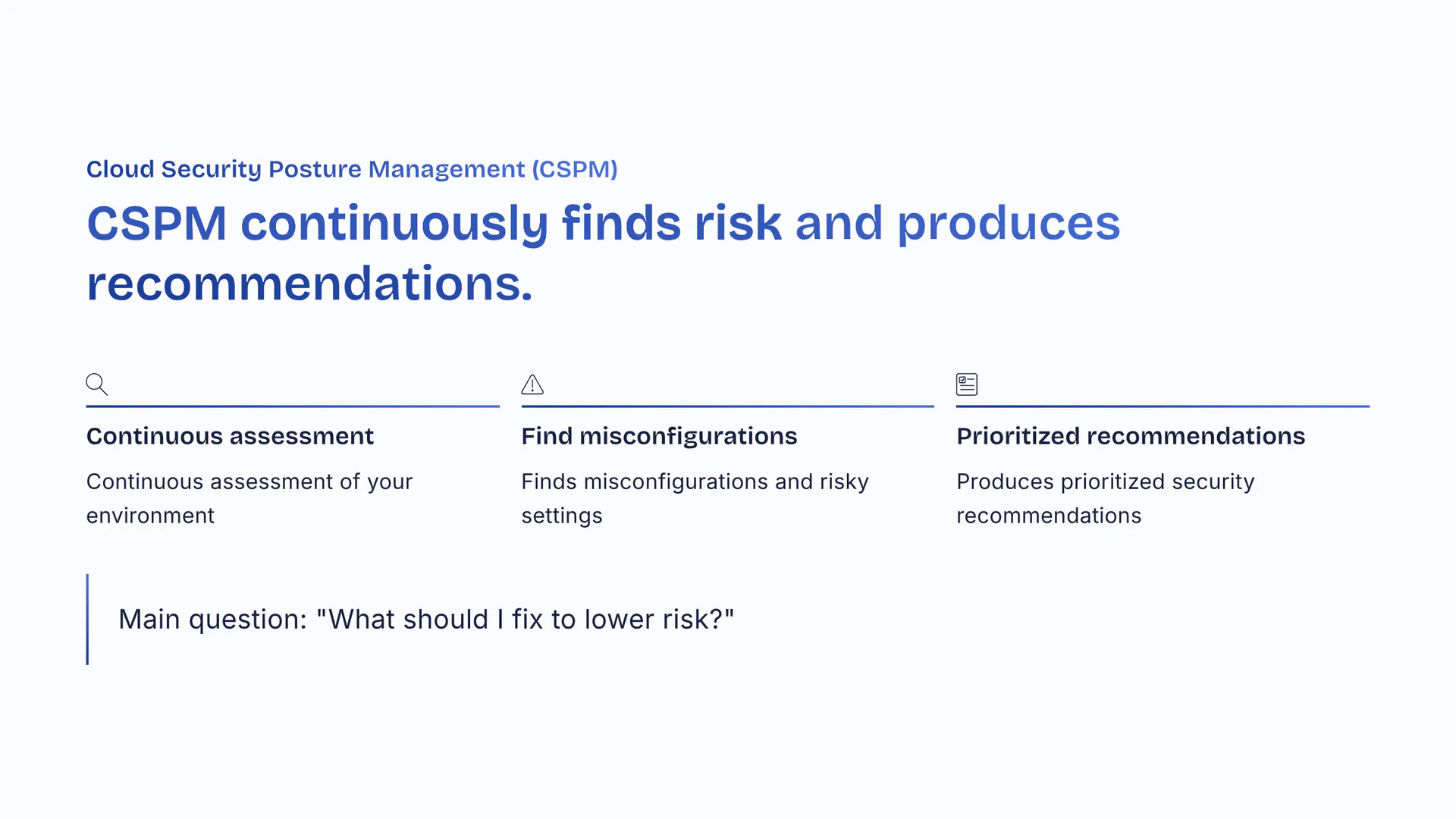 CSPM continuously finds risk and produces recommendations. Continuous assessment of your environment. Finds misconfigurations and risky settings. Produces prioritized security recommendations. Main question: 'What should I fix to lower risk?'