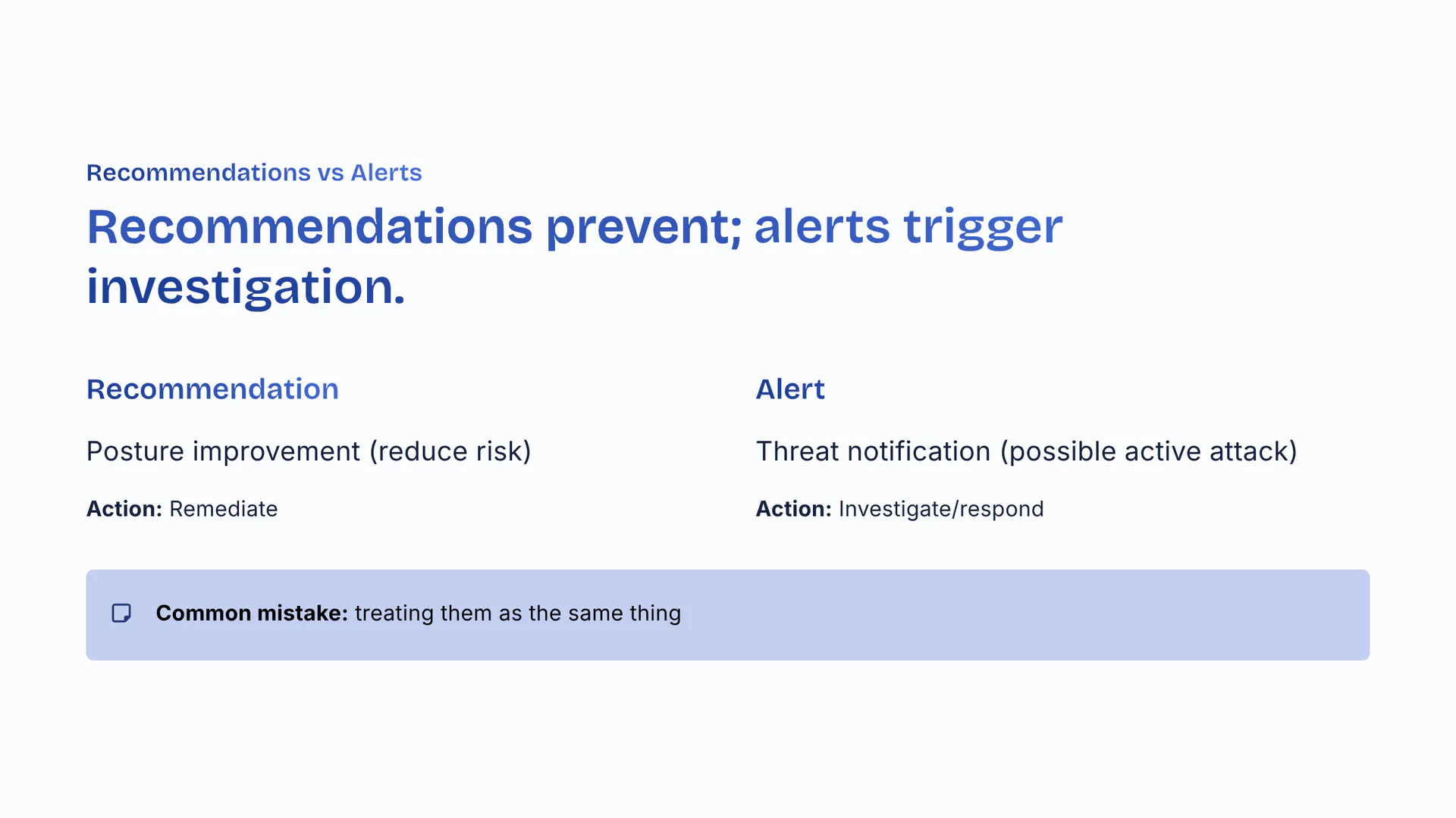 Recommendations prevent; alerts trigger investigation. Recommendation equals posture improvement (reduce risk). Alert equals threat notification (possible active attack). Different actions: remediate vs investigate/respond. Common mistake: treating them as the same thing.