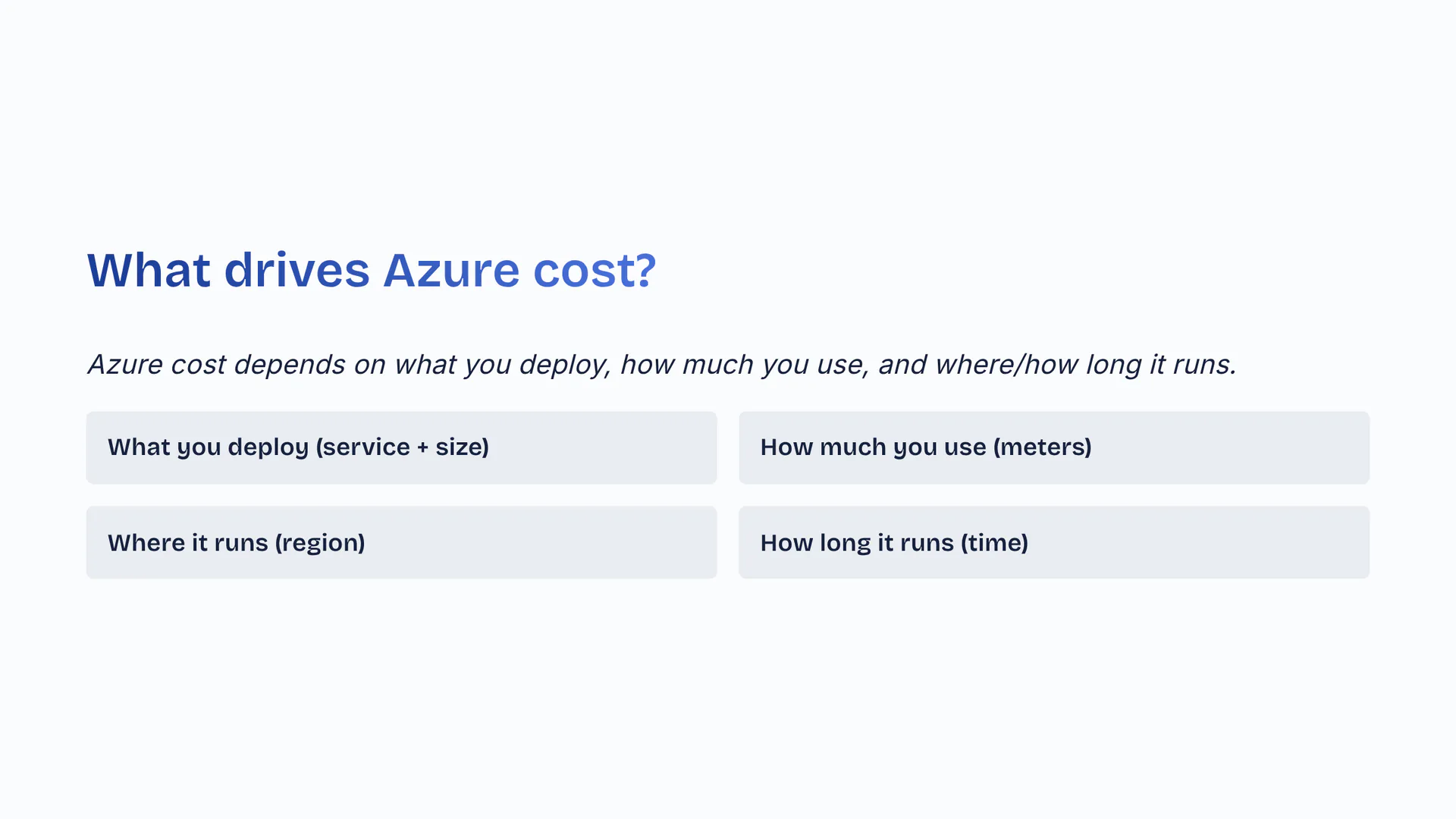 What drives Azure cost?Azure cost depends on what you deploy, how much you use, and where/how long it runs. What you deploy (service plus size). How much you use (meters). Where it runs (region). How long it runs (time).