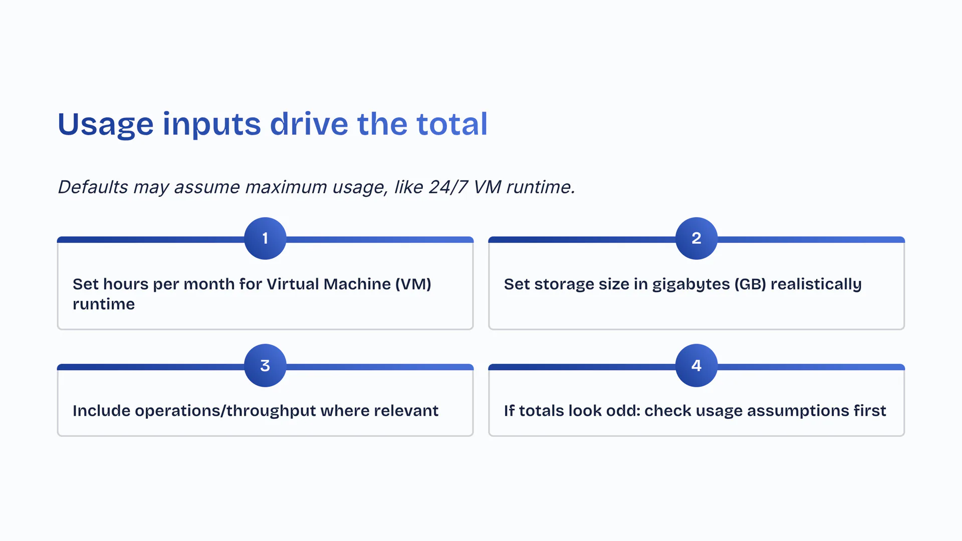 Defaults may assume maximum usage, like 24/7 VM runtime. Set hours per month for Virtual Machine (VM) runtime. Set storage size in gigabytes (GB) realistically. Include operations/throughput where relevant. If totals look odd: check usage assumptions first.