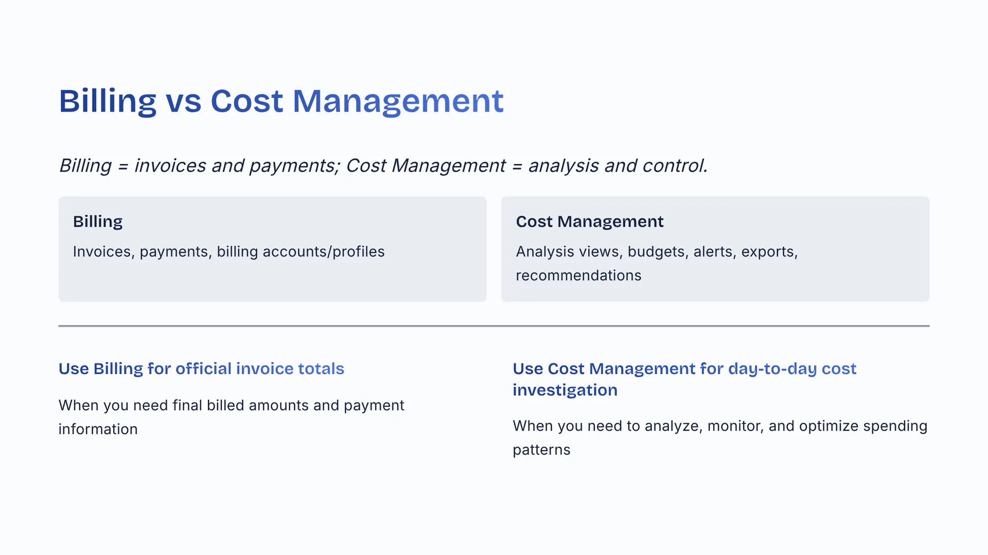 Billing equals invoices and payments; Cost Management equals analysis and control. Billing: invoices, payments, billing accounts/profiles. Cost Management: analysis views, budgets, alerts, exports, recommendations. Use Billing for official invoice totals. Use Cost Management for day-to-day cost investigation.