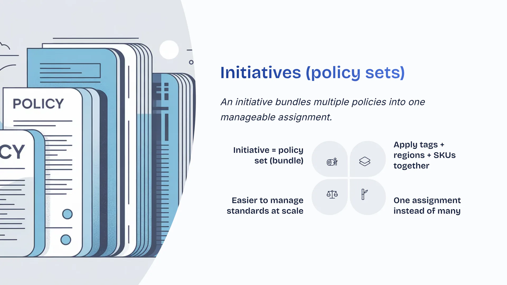Initiatives (policy sets)An initiative bundles multiple policies into one manageable assignment. Initiative equals policy set (bundle). Apply tags plus regions plus SKUs together. One assignment instead of many. Easier to manage standards at scale.