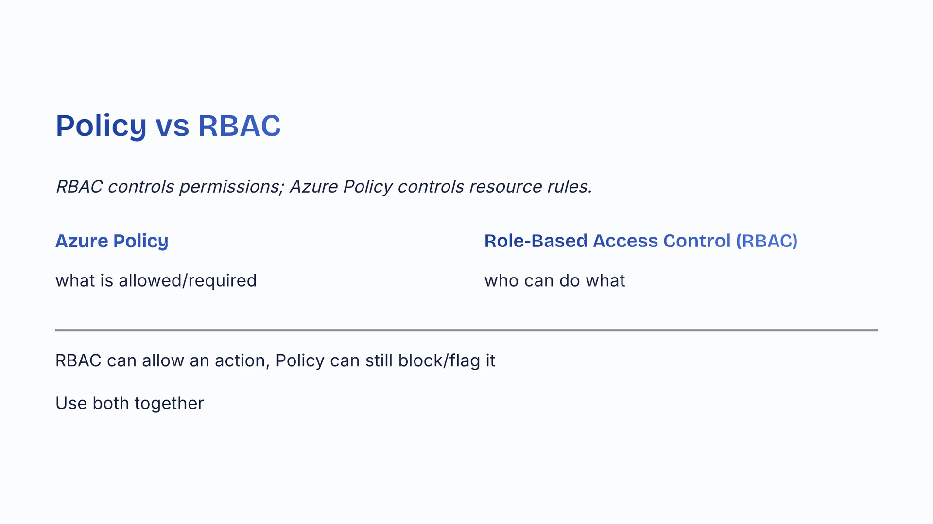 Policy vs RBACRBAC controls permissions; Azure Policy controls resource rules. Azure Policy: what is allowed/required. Role-Based Access Control (RBAC): who can do what. RBAC can allow an action, Policy can still block/flag it. Use both together.