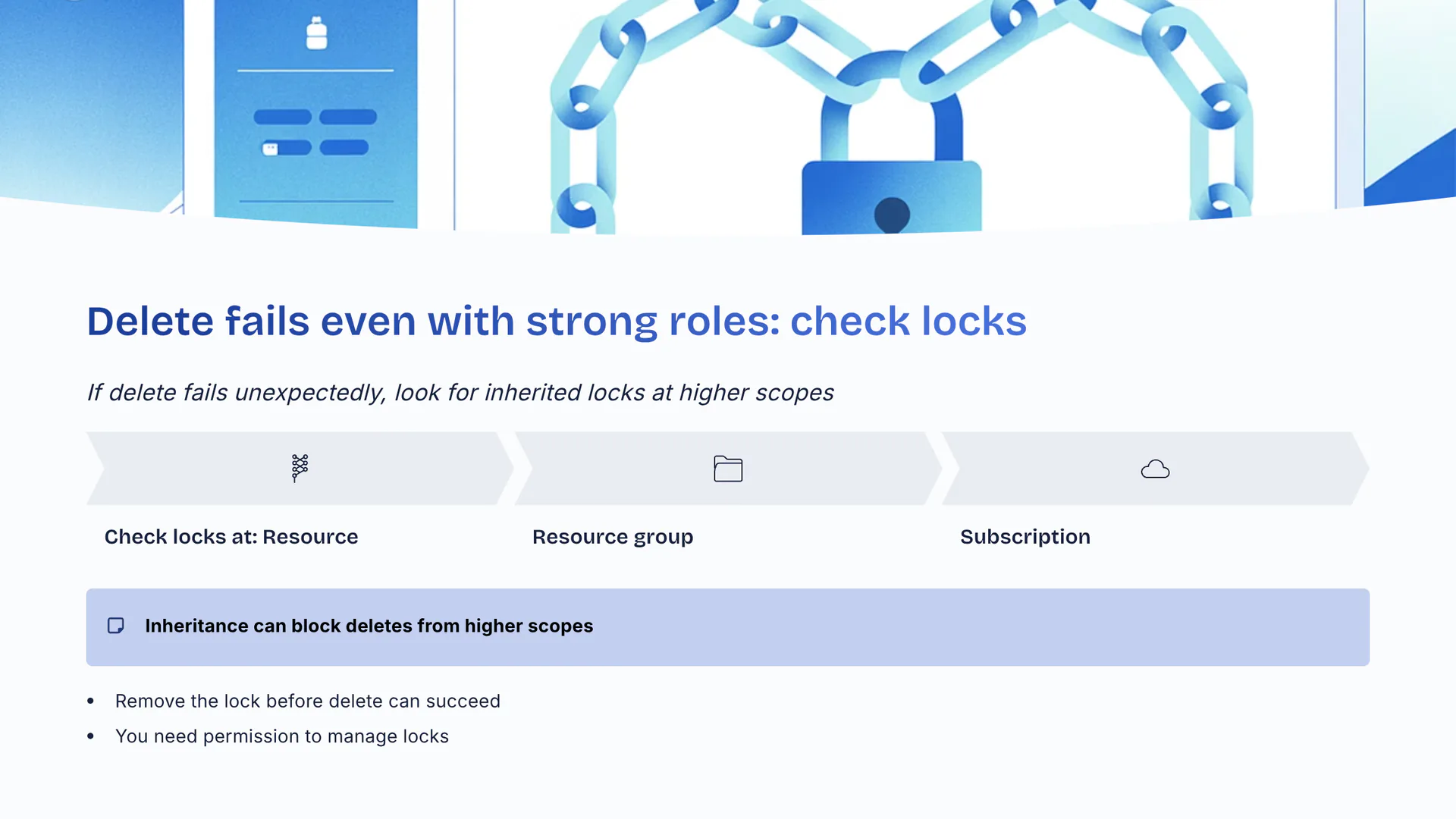 If delete fails unexpectedly, look for inherited locks at higher scopes. Check locks at: Resource to Resource group to Subscription. Inheritance can block deletes from higher scopes. Remove the lock before delete can succeed. You need permission to manage locks.