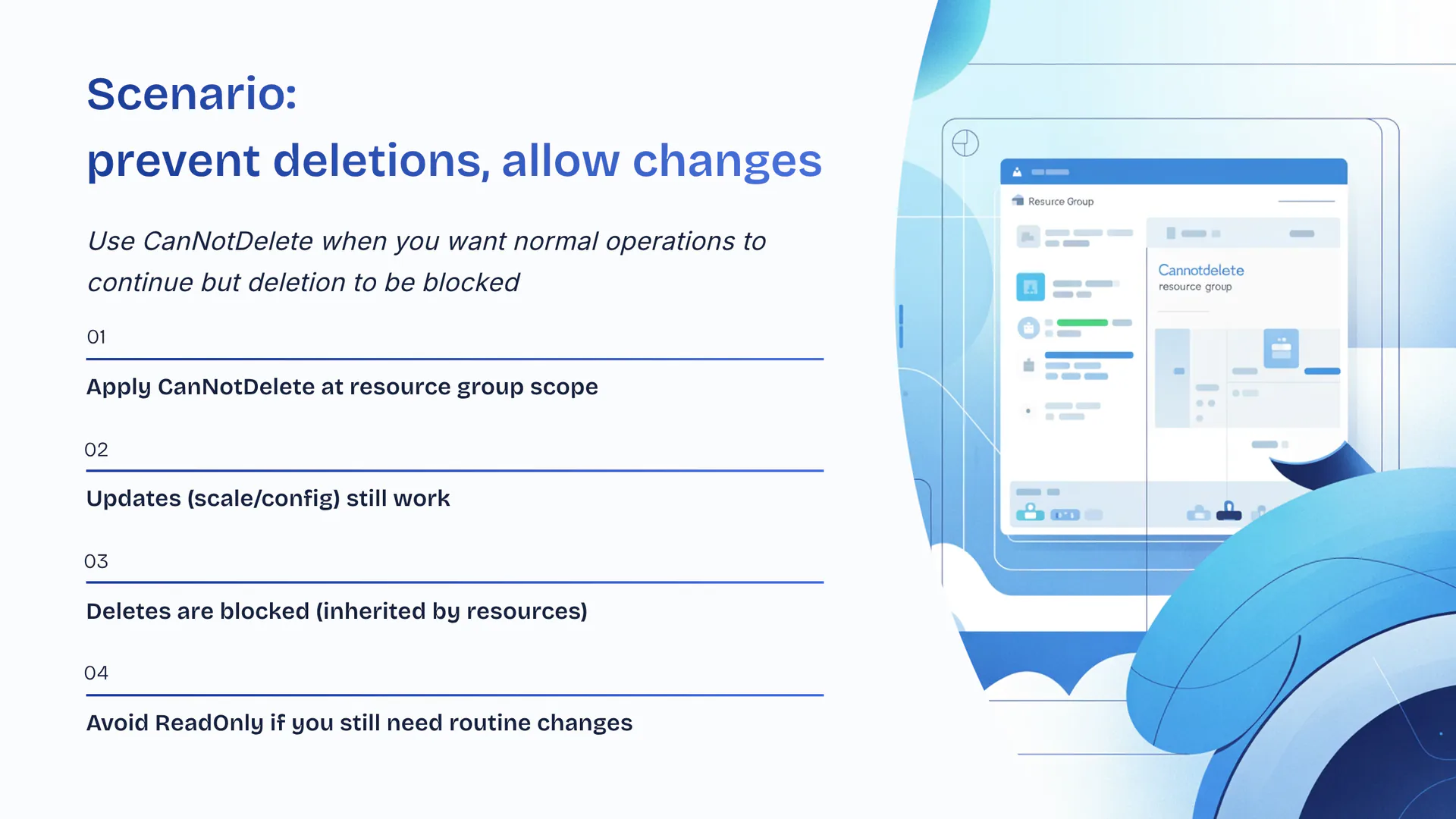 Use CanNotDelete when you want normal operations to continue but deletion to be blocked. Apply CanNotDelete at resource group scope. Updates (scale/config) still work. Deletes are blocked (inherited by resources). Avoid ReadOnly if you still need routine changes.
