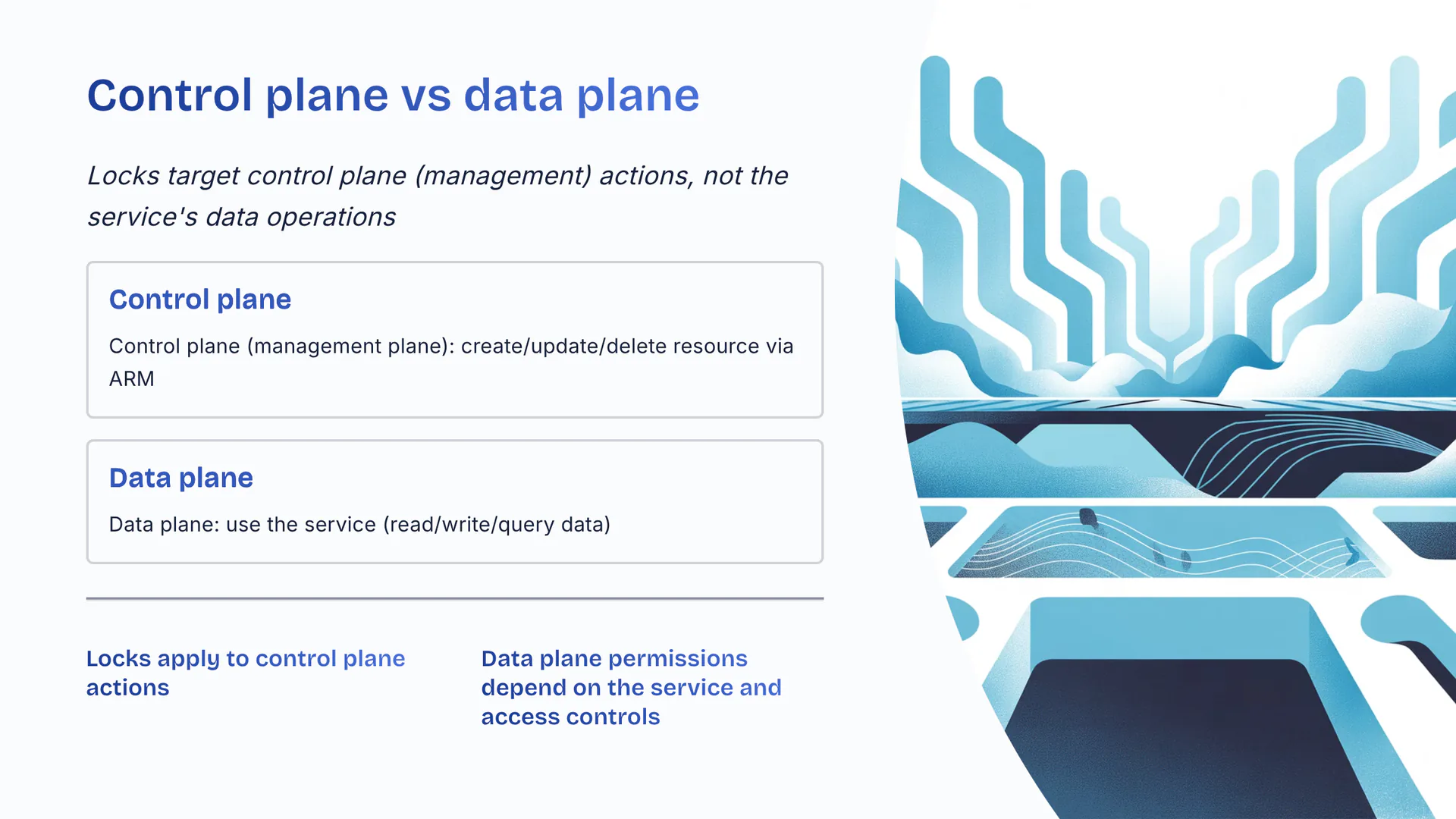Locks target control plane (management) actions, not the service's data operations. Control plane (management plane): create/update/delete resource via ARM. Data plane: use the service (read/write/query data). Locks apply to control plane actions. Data plane permissions depend on the service and access controls.
