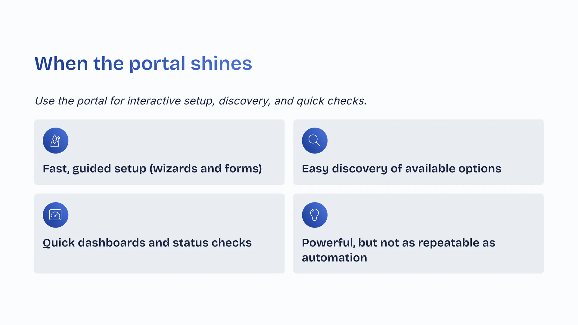 When the portal shinesUse the portal for interactive setup, discovery, and quick checks. Fast, guided setup (wizards and forms). Easy discovery of available options. Quick dashboards and status checks. Powerful, but not as repeatable as automation.