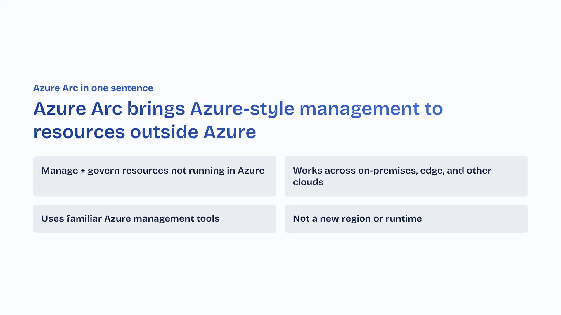 Azure Arc brings Azure-style management to resources outside Azure. Manage plus govern resources not running in Azure. Works across on-premises, edge, and other clouds. Uses familiar Azure management tools. Not a new region or runtime.