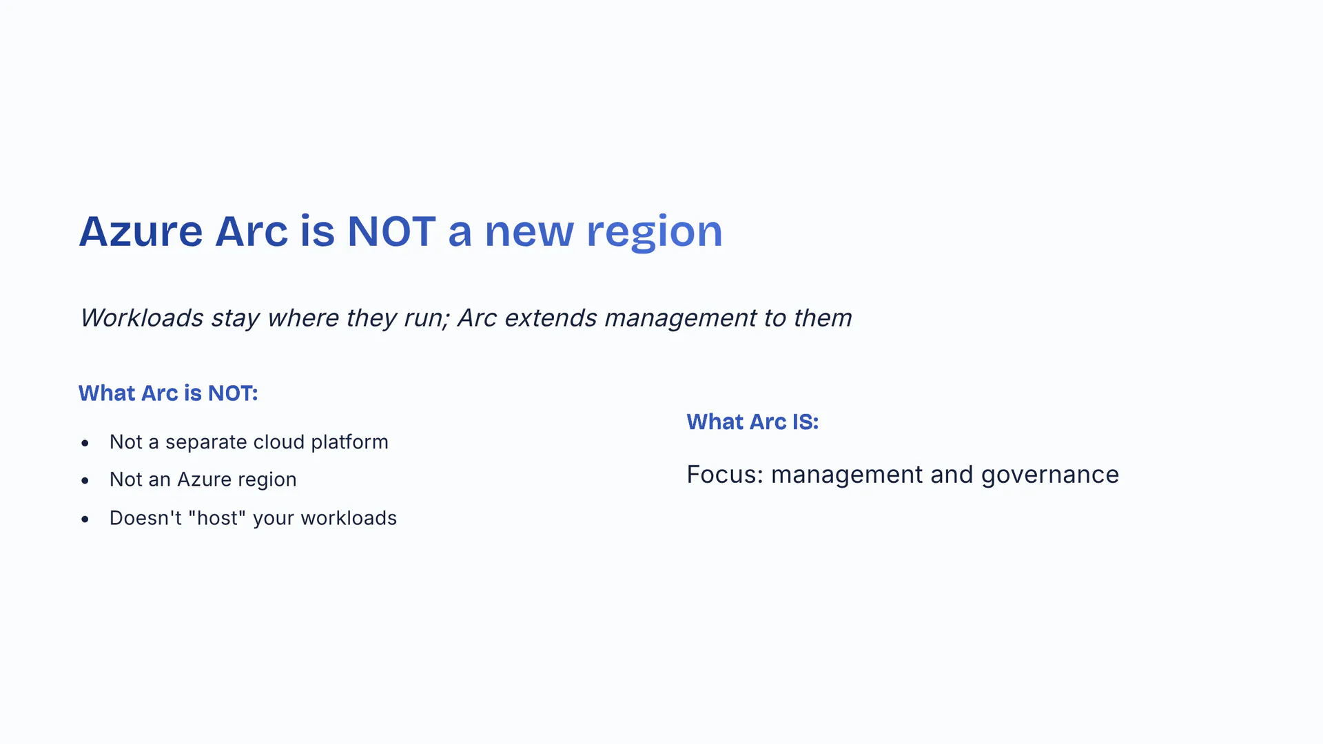 Workloads stay where they run; Arc extends management to them. Not a separate cloud platform. Not an Azure region. Doesn't 'host' your workloads. Focus: management and governance.