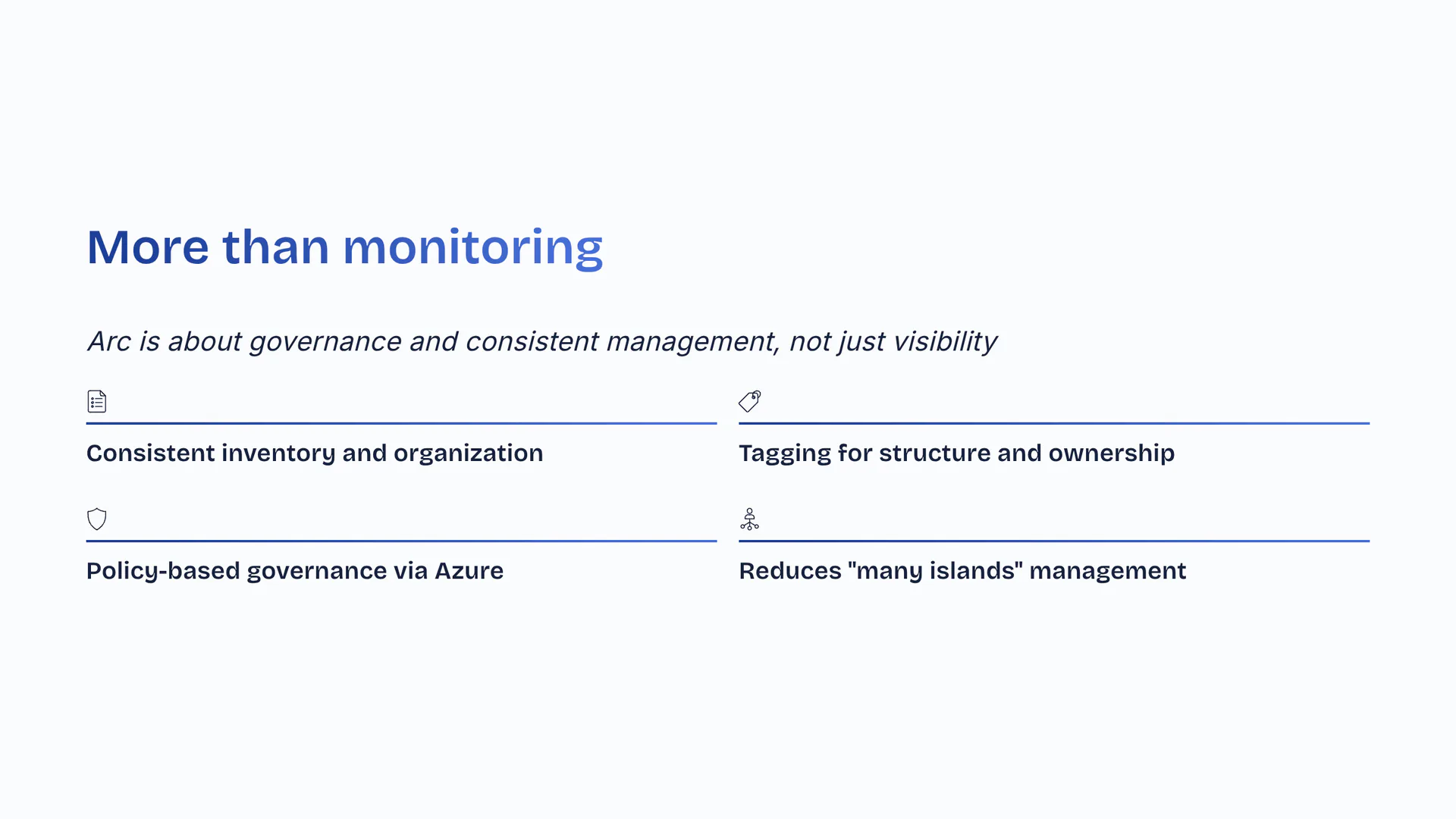 Arc is about governance and consistent management, not just visibility. Consistent inventory and organization. Tagging for structure and ownership. Policy-based governance via Azure. Reduces 'many islands' management.