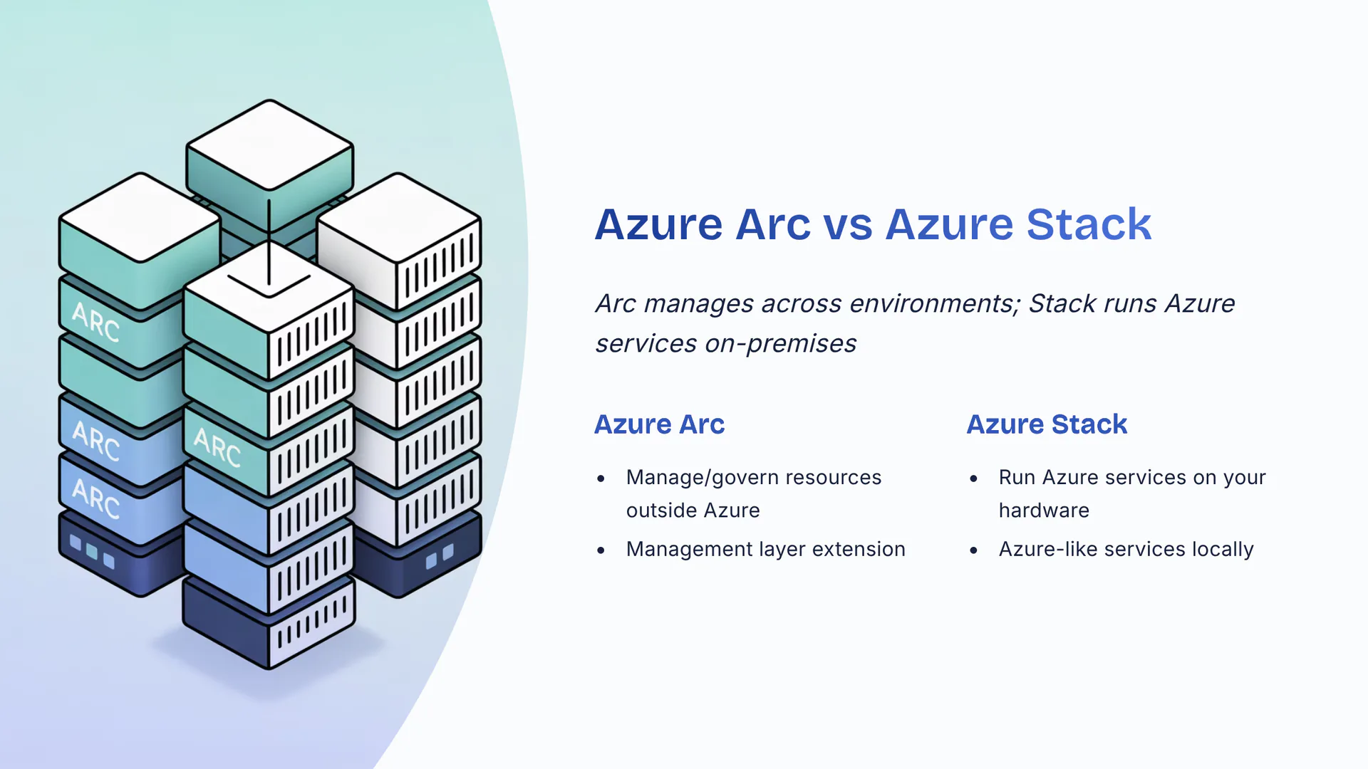 Arc manages across environments; Stack runs Azure services on-premises. Azure Arc: manage/govern resources outside Azure. Azure Stack: run Azure services on your hardware. Arc equals management layer extension. Stack equals Azure-like services locally.