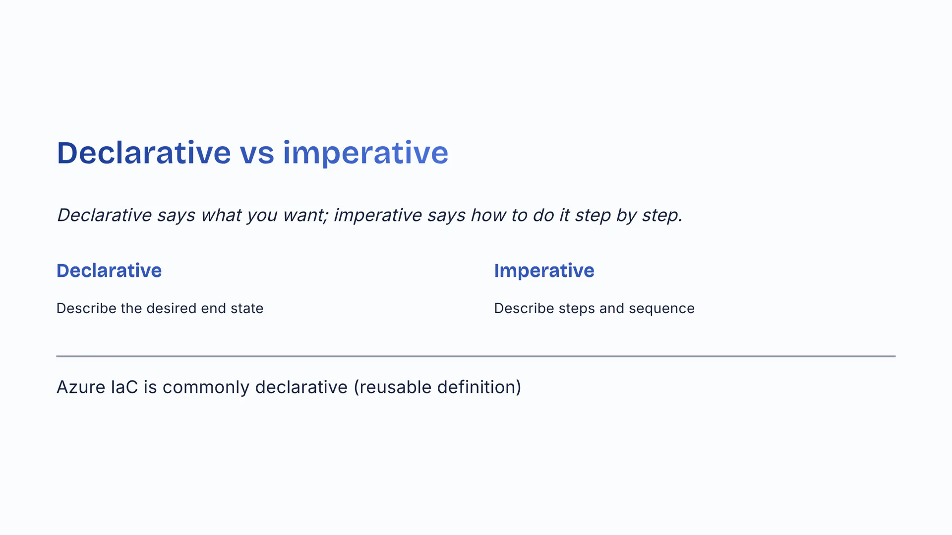 Declarative vs imperativeDeclarative says what you want; imperative says how to do it step by step. Declarative: describe the desired end state. Imperative: describe steps and sequence. Azure IaC is commonly declarative (reusable definition).