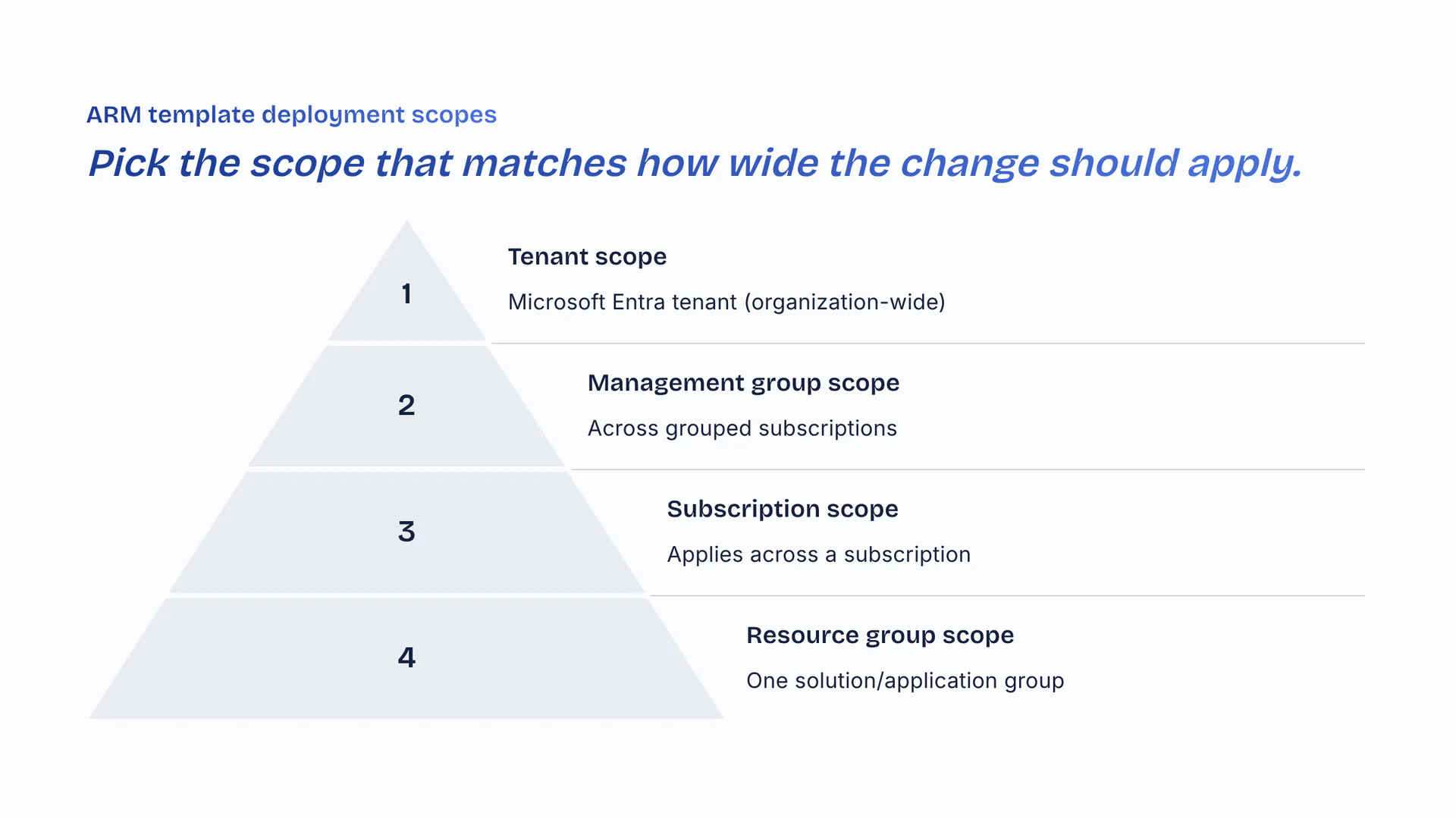 Pick the scope that matches how wide the change should apply. Resource group scope: one solution/application group. Subscription scope: applies across a subscription. Management group scope: across grouped subscriptions. Tenant scope: Microsoft Entra tenant (organization-wide).