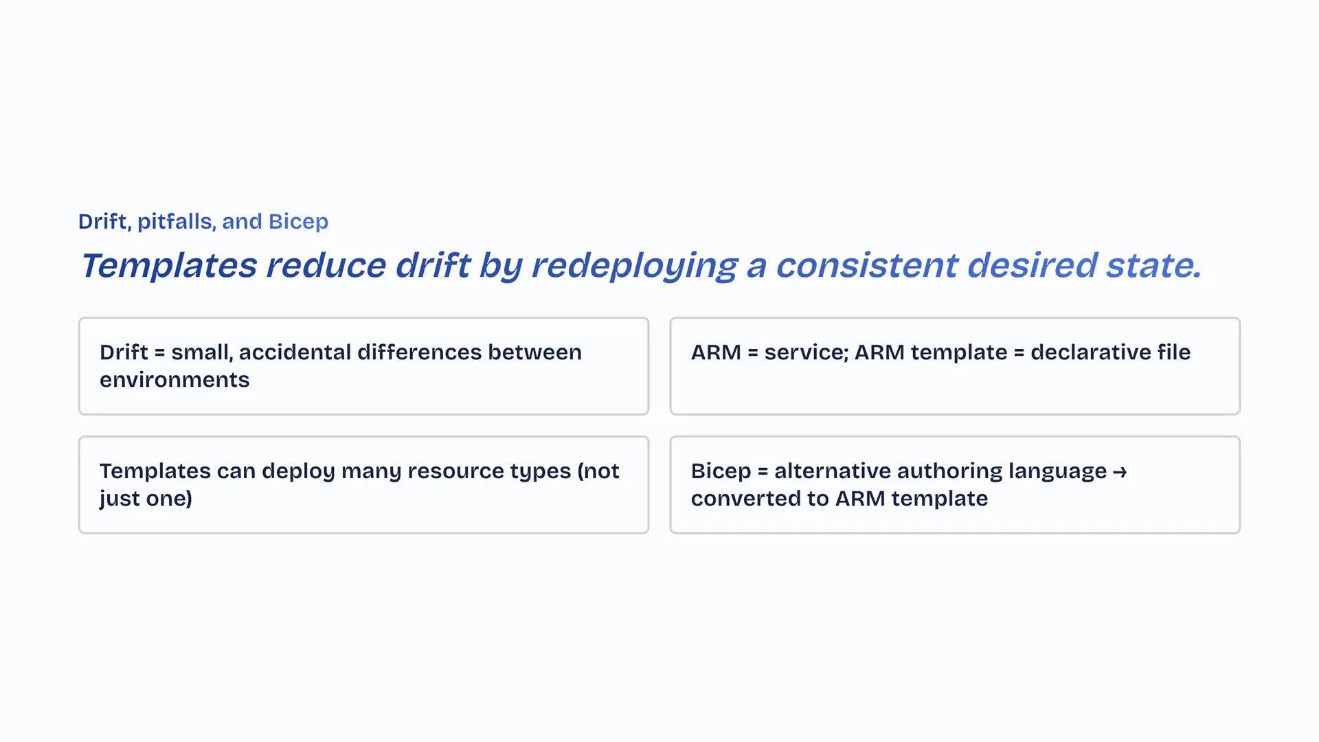 Templates reduce drift by redeploying a consistent desired state. Drift equals small, accidental differences between environments. ARM equals service; ARM template equals declarative file. Templates can deploy many resource types (not just one). Bicep equals alternative authoring language to converted to ARM template.