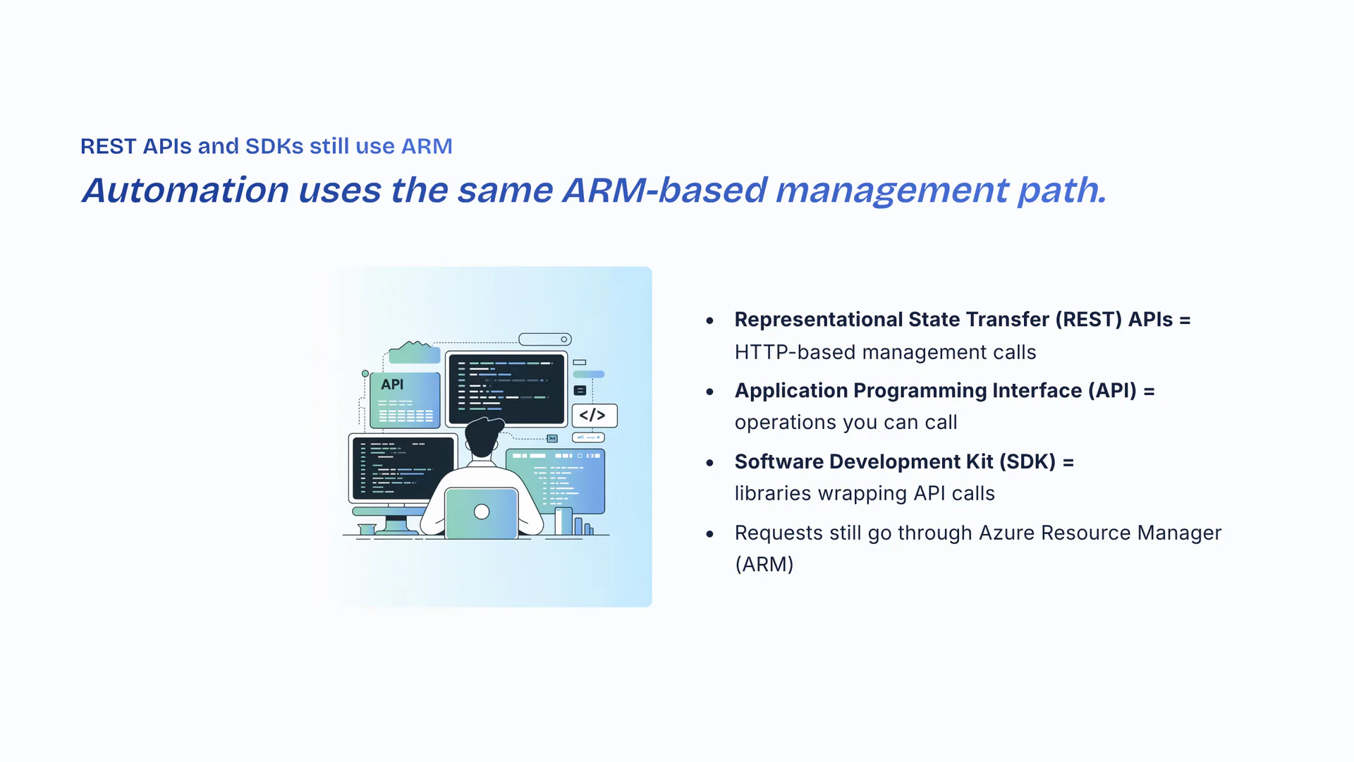 Automation uses the same ARM-based management path. Representational State Transfer (REST) APIs equals HTTP-based management calls. Application Programming Interface (API) equals operations you can call. Software Development Kit (SDK) equals libraries wrapping API calls. Requests still go through Azure Resource Manager (ARM).