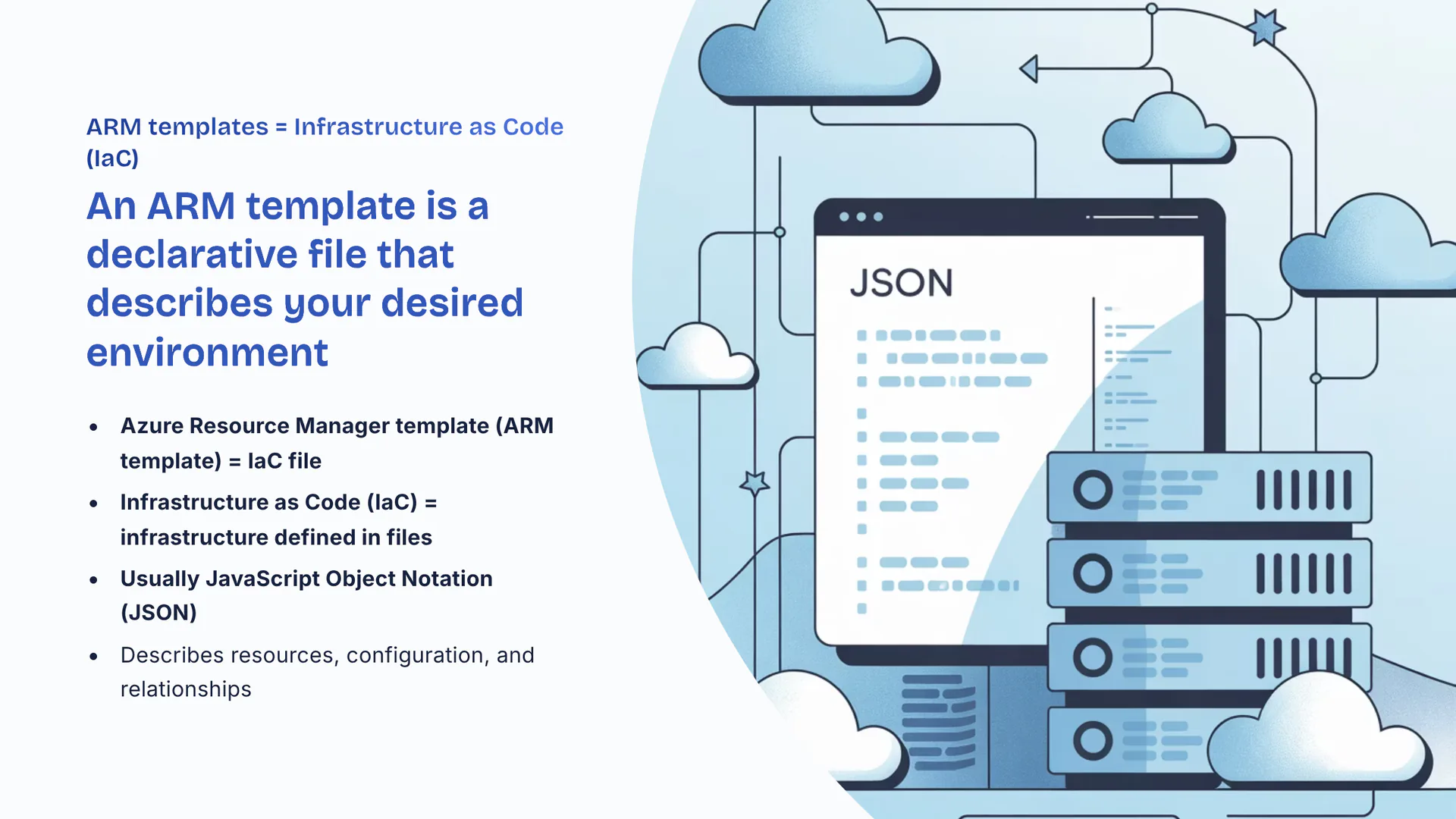 An ARM template is a declarative file that describes your desired environment. Azure Resource Manager template (ARM template) equals IaC file. Infrastructure as Code (IaC) equals infrastructure defined in files. Usually JavaScript Object Notation (JSON). Describes resources, configuration, and relationships.