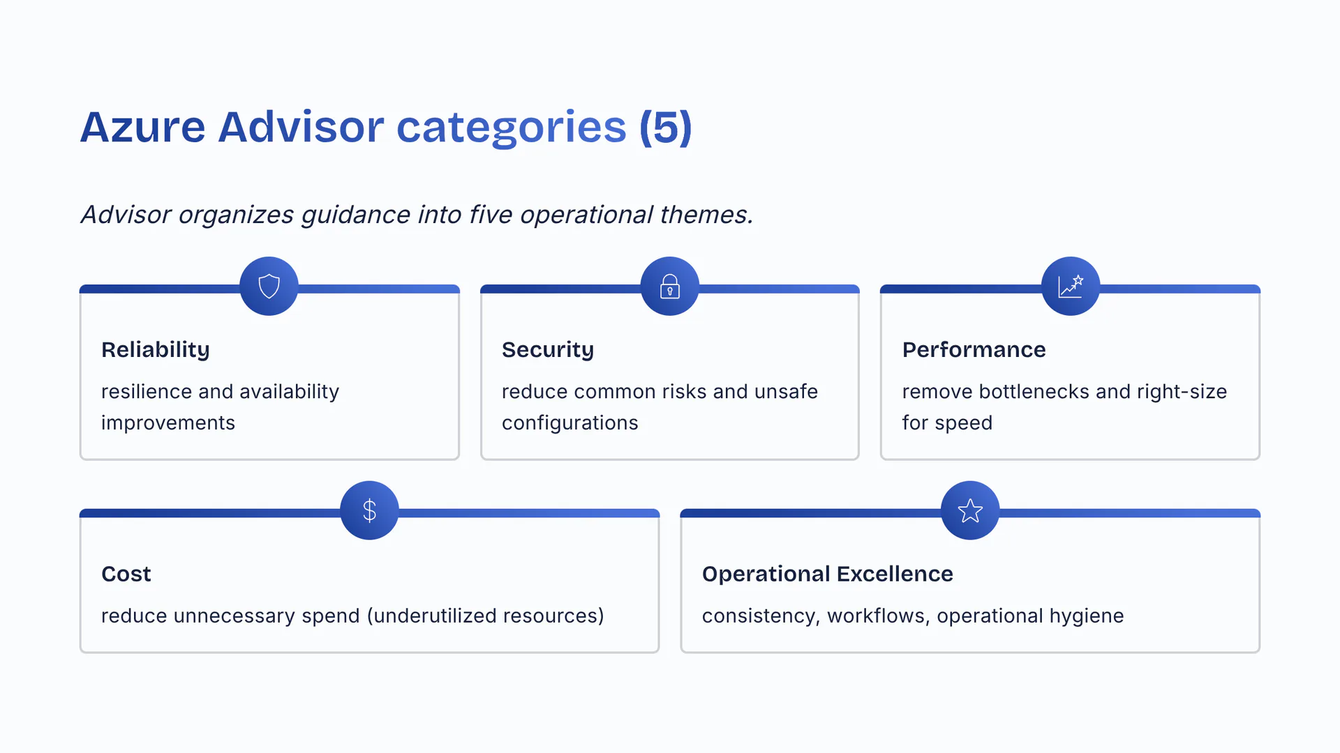 Advisor organizes guidance into five operational themes. Reliability: resilience and availability improvements. Security: reduce common risks and unsafe configurations. Performance: remove bottlenecks and right-size for speed. Cost: reduce unnecessary spend (underutilized resources). Operational Excellence: consistency, workflows, operational hygiene.