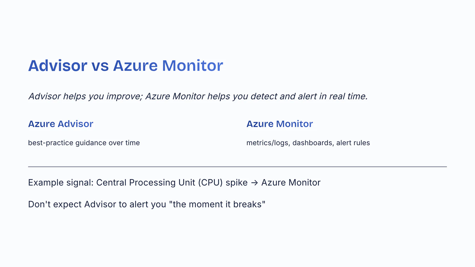 Advisor helps you improve; Azure Monitor helps you detect and alert in real time. Azure Advisor: best-practice guidance over time. Azure Monitor: metrics/logs, dashboards, alert rules. Example signal: Central Processing Unit (CPU) spike to Azure Monitor. Don't expect Advisor to alert you 'the moment it breaks'.