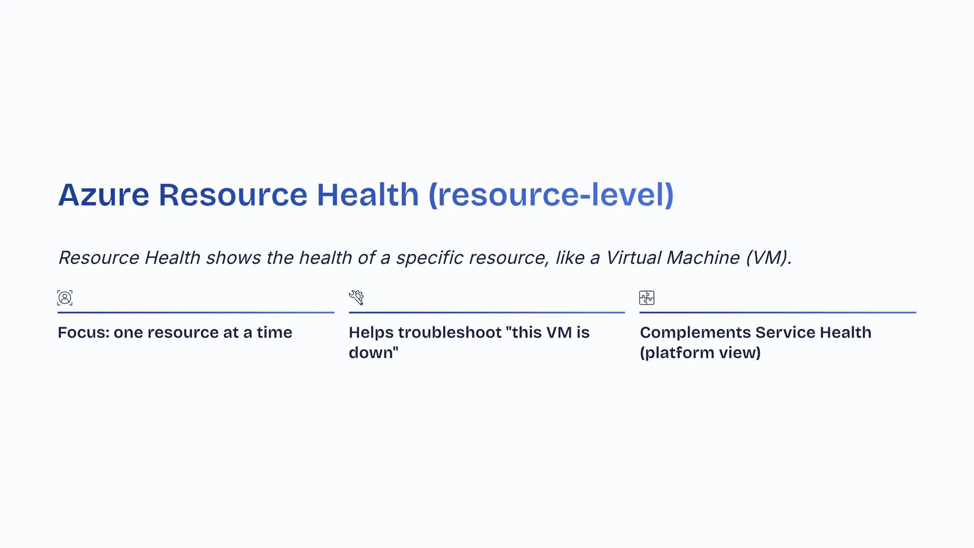 Azure Resource Health (resource-level)Resource Health shows the health of a specific resource, like a Virtual Machine (VM). Focus: one resource at a time. Helps troubleshoot 'this VM is down'. Complements Service Health (platform view).
