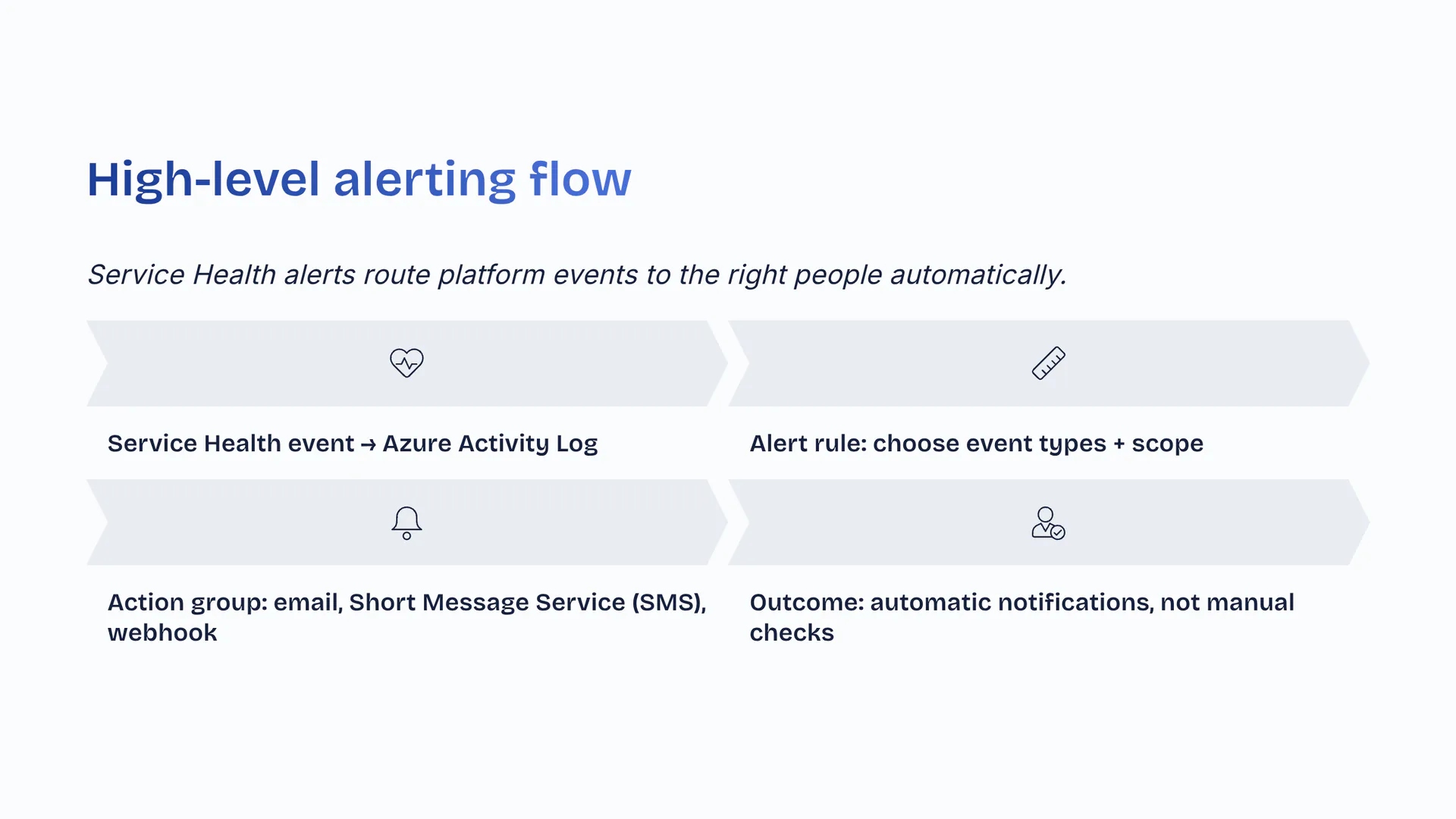 Service Health alerts route platform events to the right people automatically. Service Health event to Azure Activity Log. Alert rule: choose event types plus scope. Action group: email, Short Message Service (SMS), webhook. Outcome: automatic notifications, not manual checks.