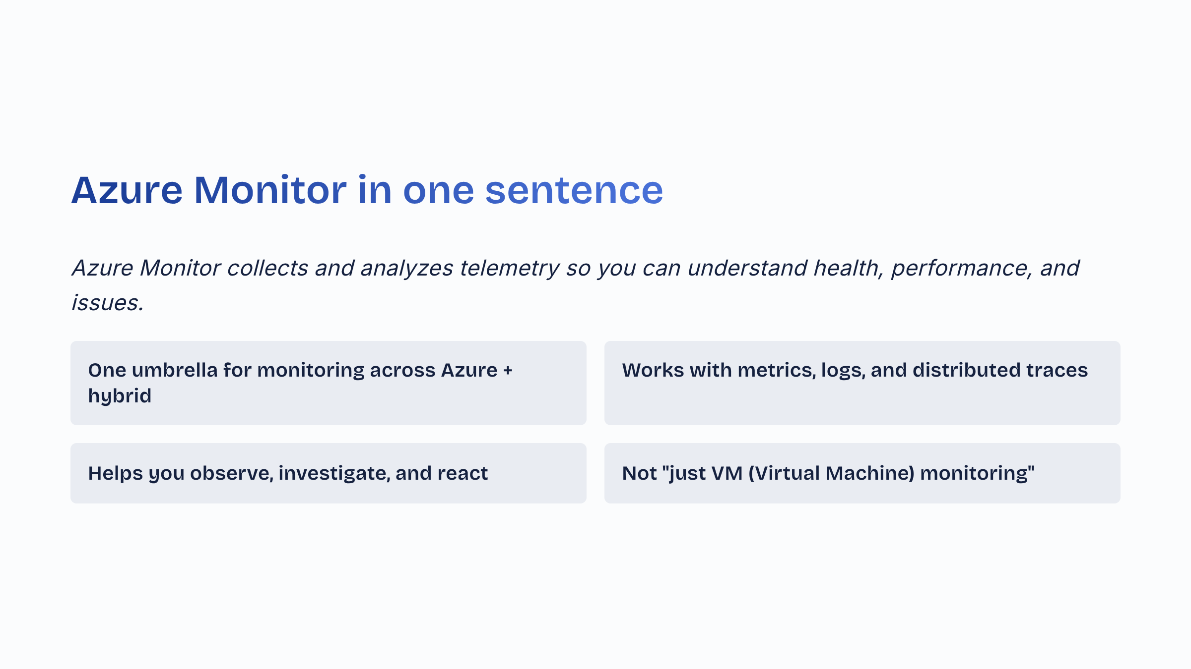 Azure Monitor collects and analyzes telemetry so you can understand health, performance, and issues. One umbrella for monitoring across Azure plus hybrid. Works with metrics, logs, and distributed traces. Helps you observe, investigate, and react. Not 'just VM (Virtual Machine) monitoring'.